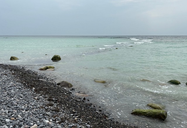 Kysten udfor Brøndehøje med let bølgebrydning henover en undersøisk ”molekonstruktion”, som der kan være en naturlig geologisk formation eller formentlig forbedret ved menneskelig indgriben for 500 år siden (foto OJJ, marts 2024)